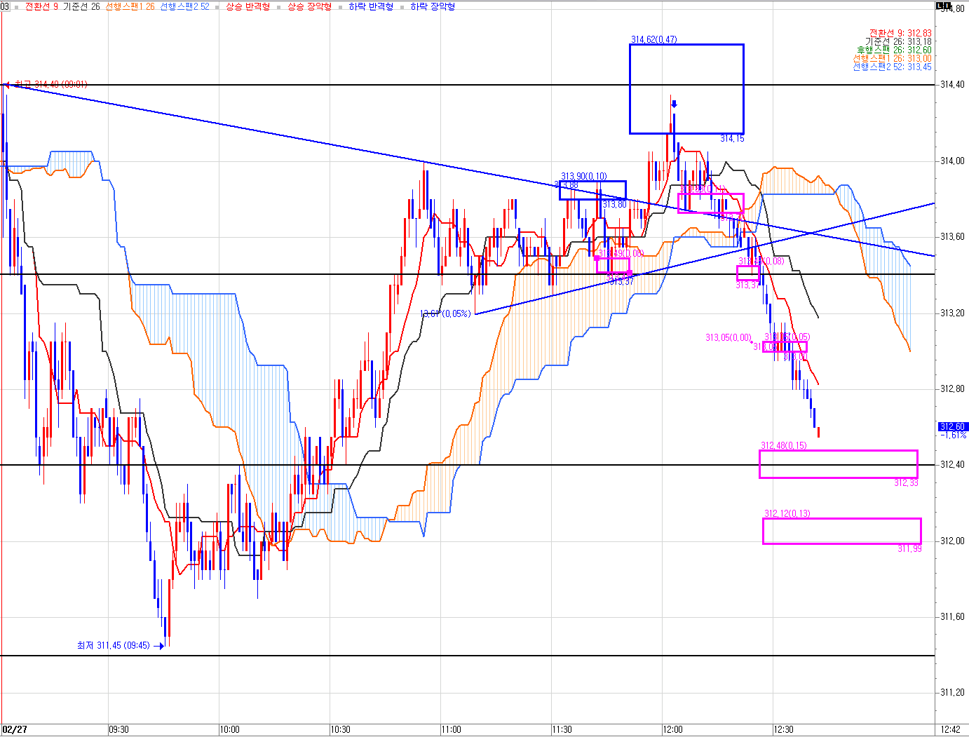 파란색 박스에서 매도를 분할 진입하여 분홍색 박스를 1차 최종목표, 2차 최종목표로 삼고 분할 수익 청산 하였다. 왜 파란색 선 3개가 강력한 저항선 인지는 일목균형차트를 실전을 통해 정확히 공부해야만 알 수 있다. 시초 갭 하락하여 시작한 첫 5분봉이 장대 음봉 이었다.