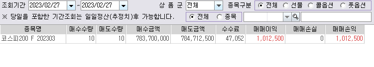 일목균형표를 활용하여 2023년 2월 27일 국내선물 실전매매 한 것을 설명한다.