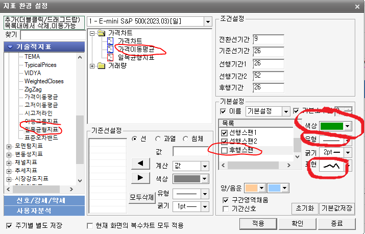 지표 환경 설정 화면에서 맨 왼쪽의 '일목균형지표'를 더블클릭하면 화면의 가운데에 일목균형지표가 추가된다.