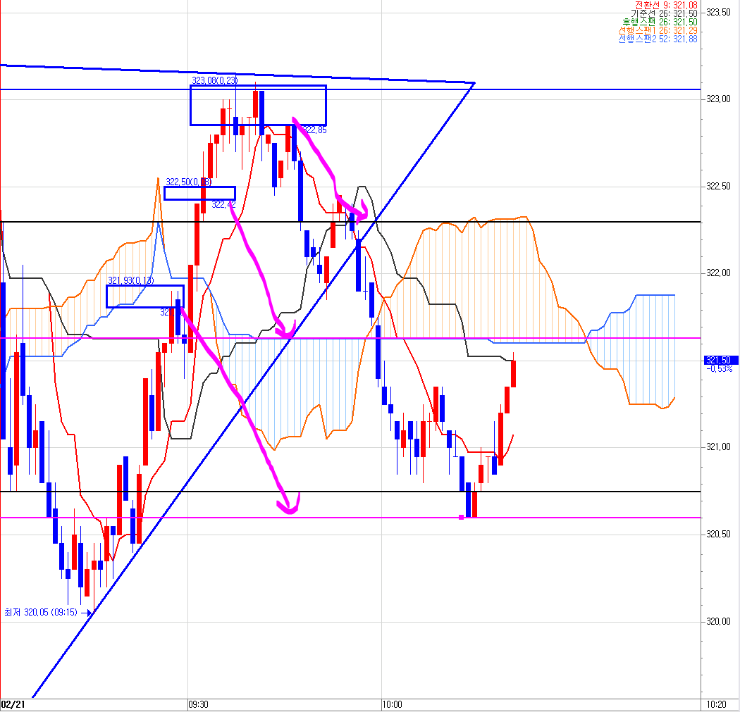 320.60에 청산하기 위해 1차 매도 진입 321.80~90, 2차 진입 322.40~50, 3차 진입 322.85~323.05 을 했다.