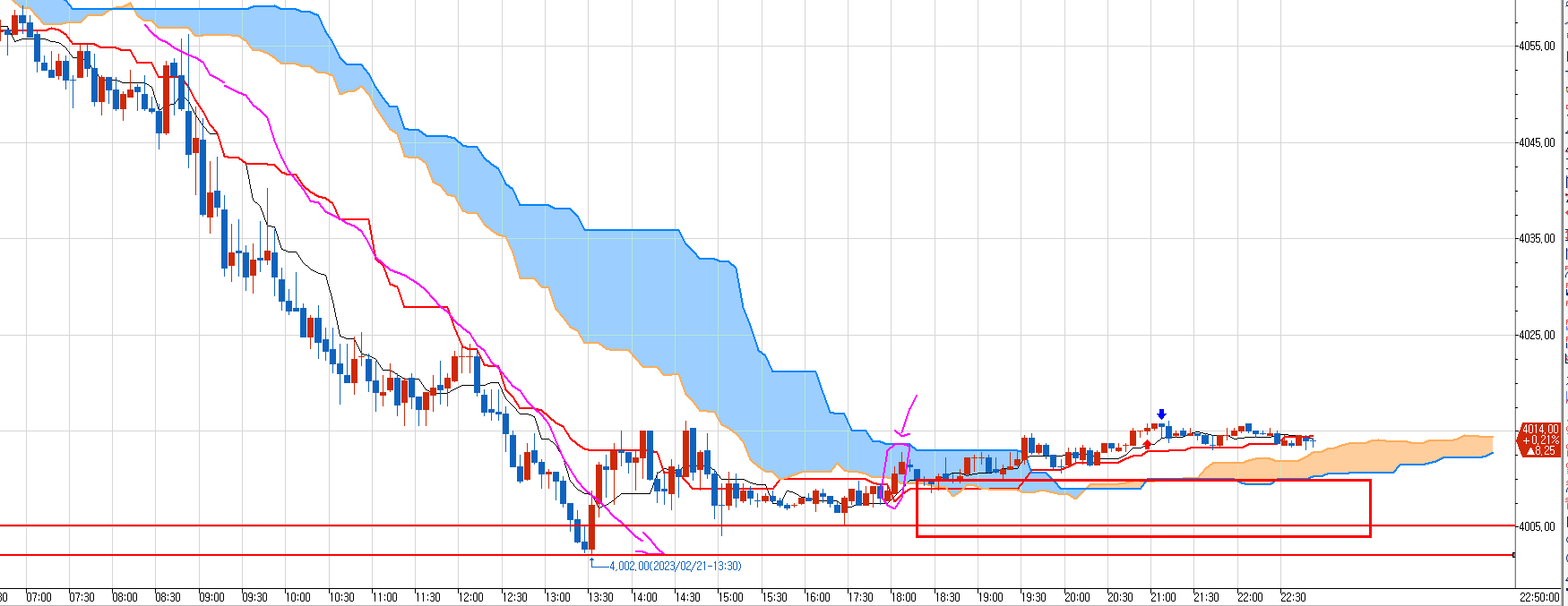 위 차트는 2023년 2월 22일 오후1시40분(한국시간) S&P 500 선물 5분봉 차트다.