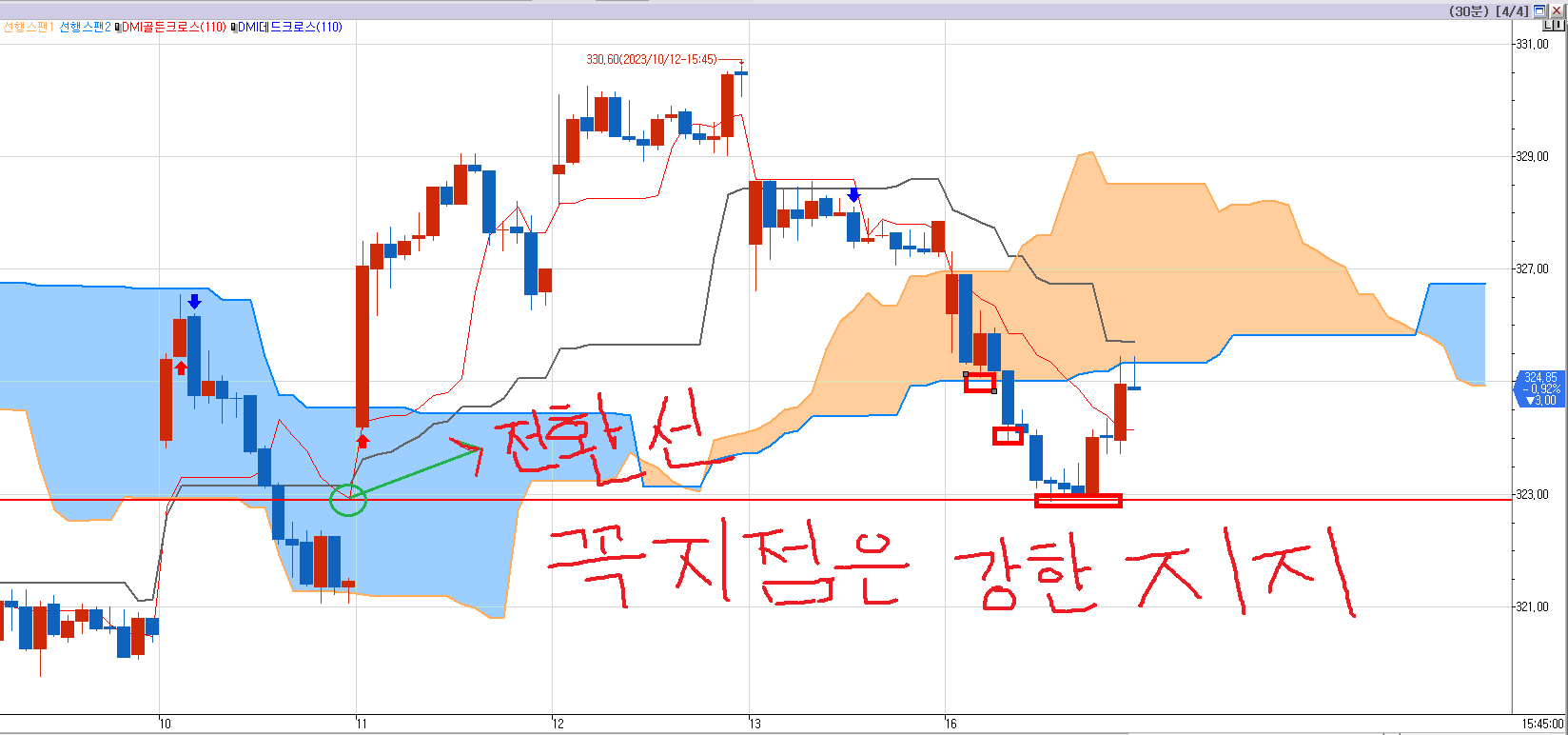 초록색 동그라미 표시한 것이 오늘 30분 차트 전환선의 끝자락 꼭지점 이다. 322.90.