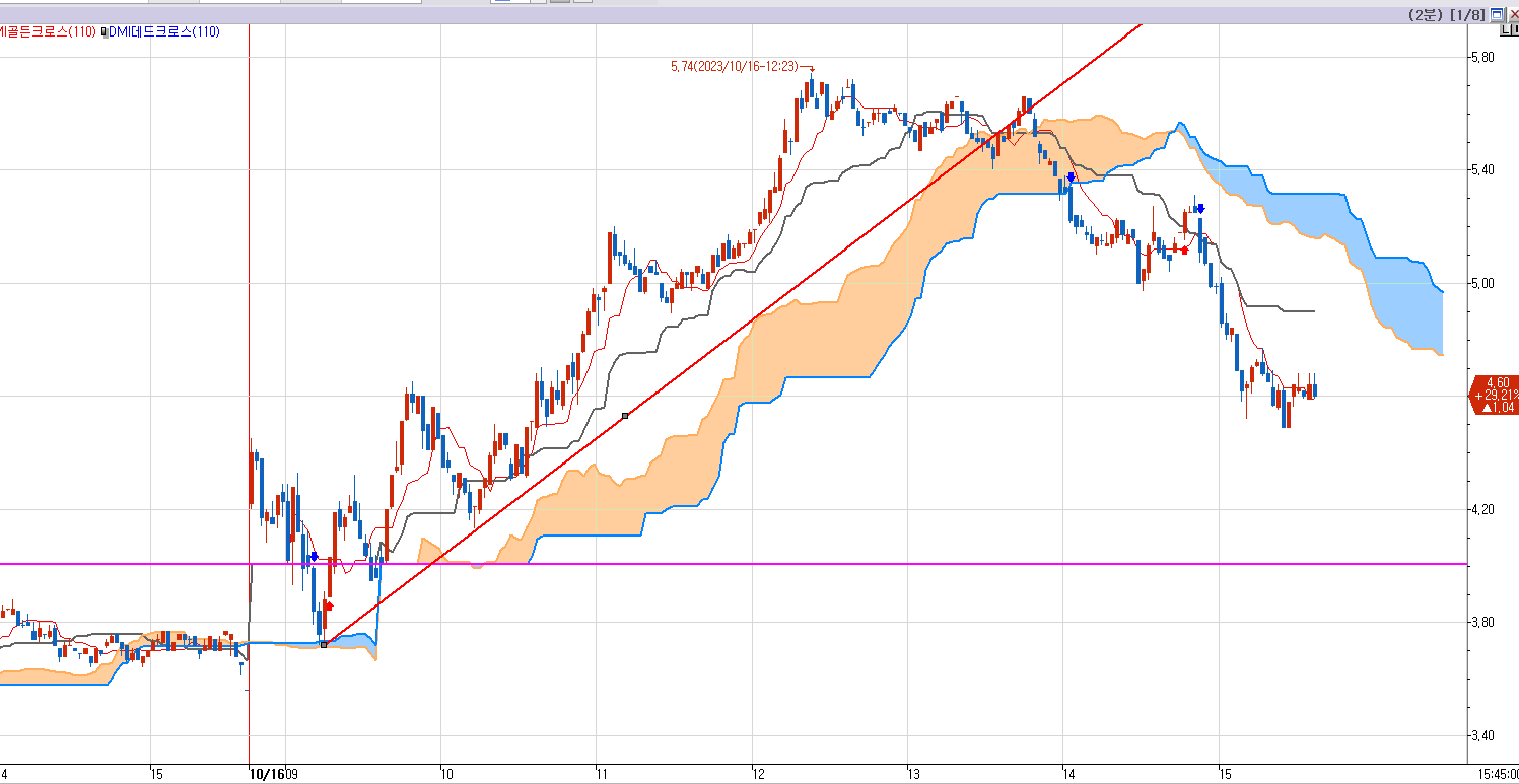 그리고 국내선물의 경우 5분봉 이상의 차트에서 기준선,전환선에 따라 지지와 저항을 찾을 수 있다고 했다.
