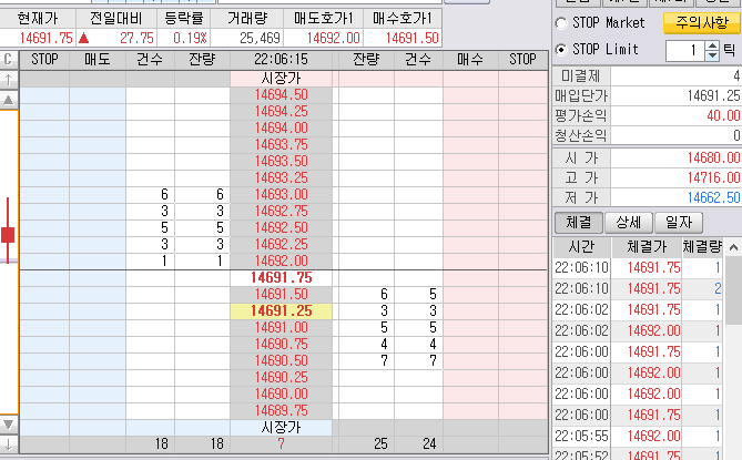 장시작 5분간 지켜보았다. 5분 양봉 세우는 것 확인 후 밑으로 쫙~ 매수 걸어 놓았다.