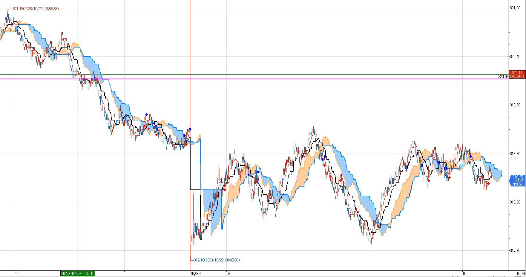 10월23일 국내선물 1분봉이다.