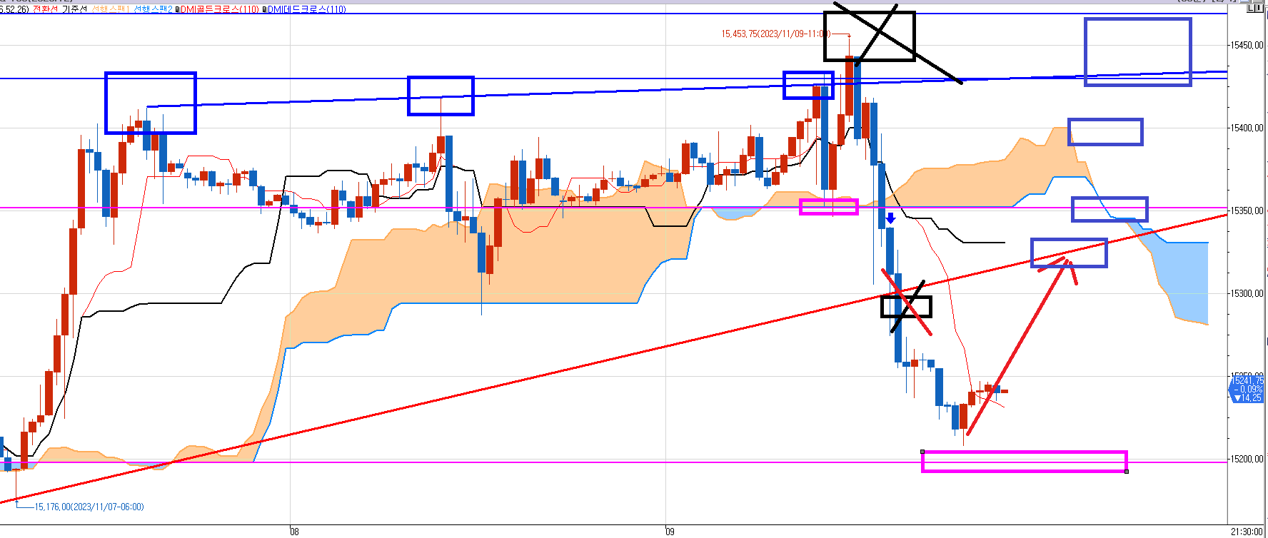어젯밤 세번째 파란박스 매도 진입 하고 15분봉에서 발생한 매도 목표가 15353에 1개 남기고 모두 청산하였고 다시 올려주면 내가 땡큐 다 받겠다고 했다.