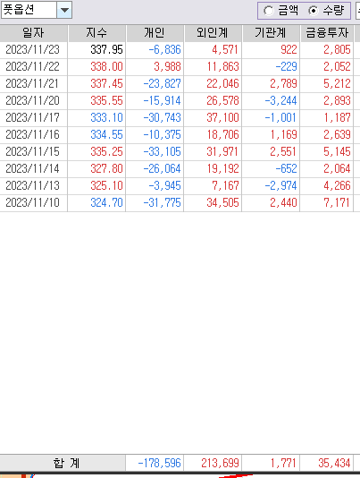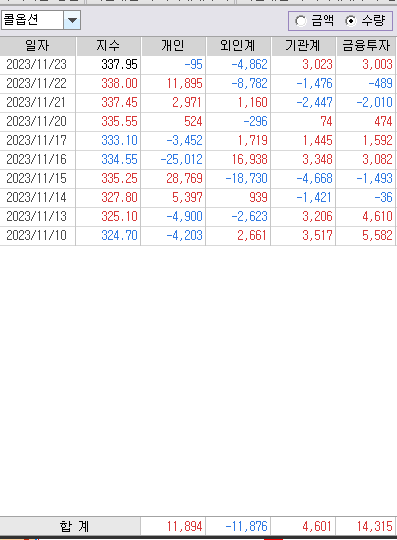 11월물 옵션 만기 후 11월10일 부터 23일까지 옵션 수급현황이다. 수량 기준이다.