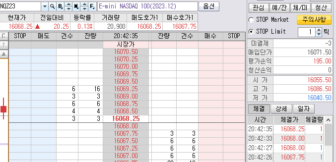 그리고 2개는 발생한 매도 목표가 16008.50 보다 8틱~15틱 사이에 청산 걸어 놓았다.