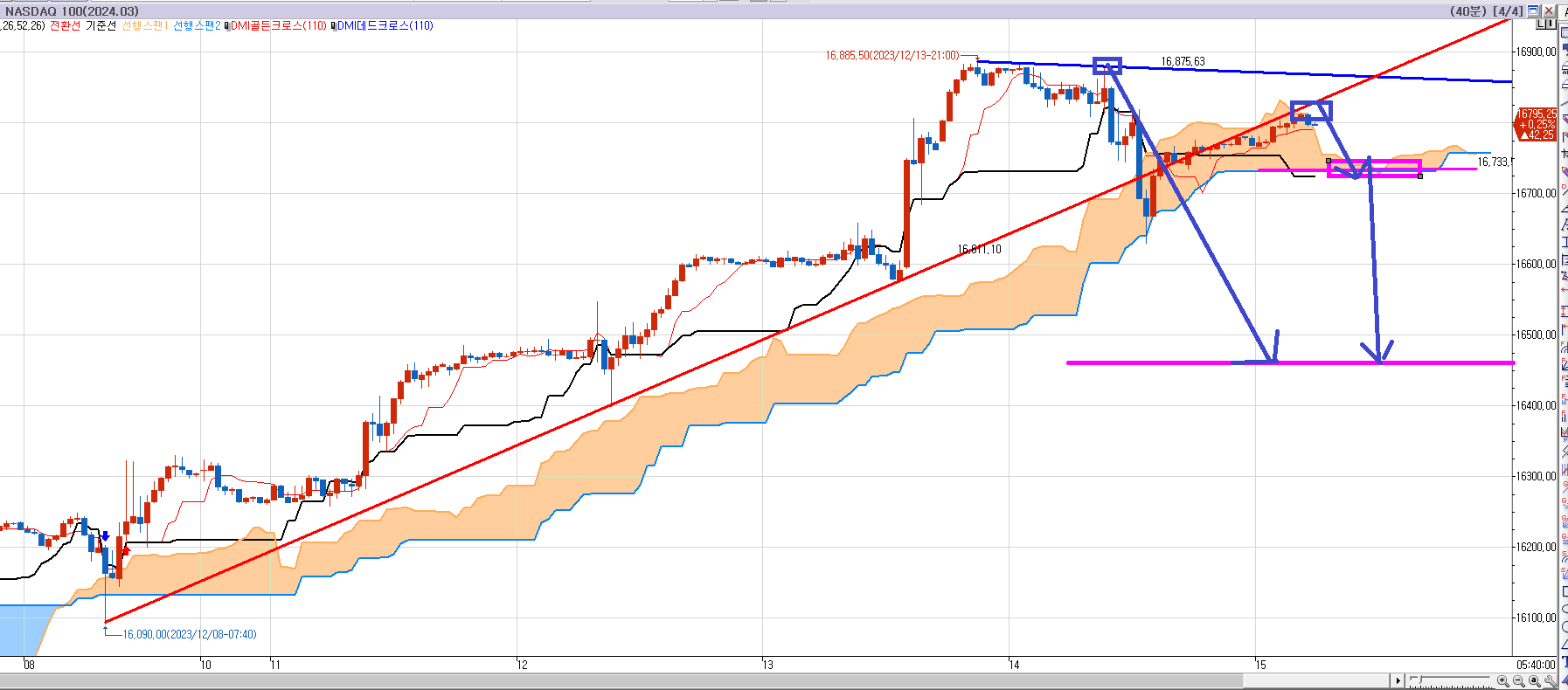 두번째 매도 목표가는 16735.00 이다. 나스닥 40분봉~60분봉사이에서 모두 발생했다.