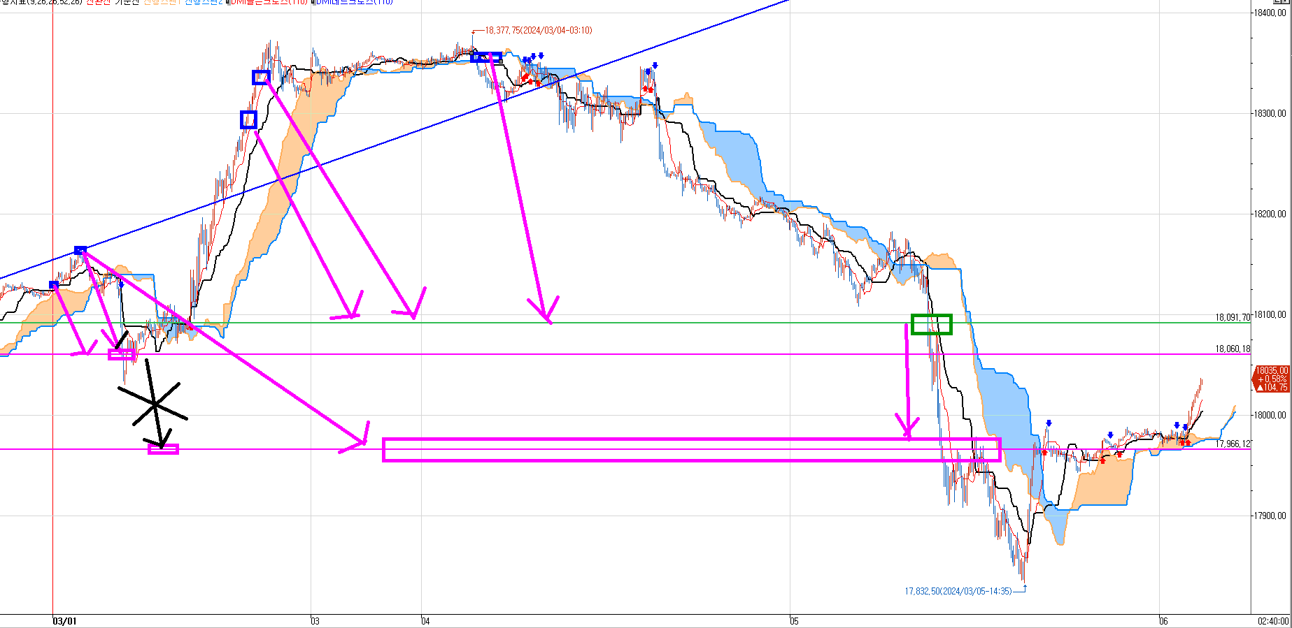 3월1일 금요일에 안치고 다시 쳐올렸던 매도 2차 목표가 17970까지 찍는 모습이다.