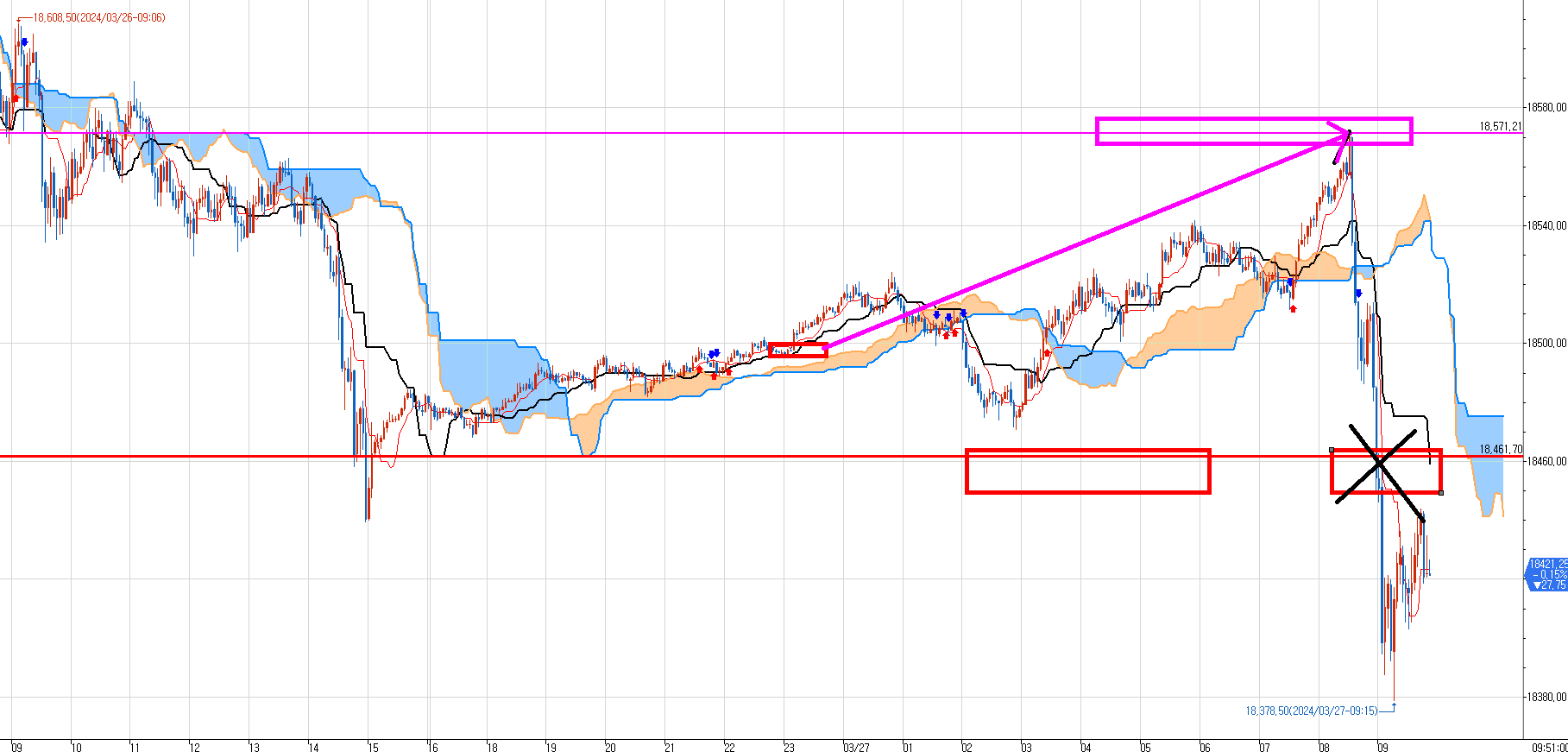 매수 목표가는 나스닥 일목균형표 3분봉에 발생한 18570!!! (분홍색선)