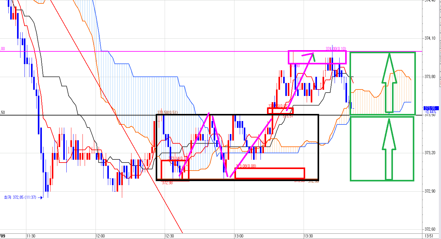 373.50 박스를 뚫었다!!! 뚷는 즉시 동물적 감각으로 373.55~60에 추가로 6개 매수 잡았다.