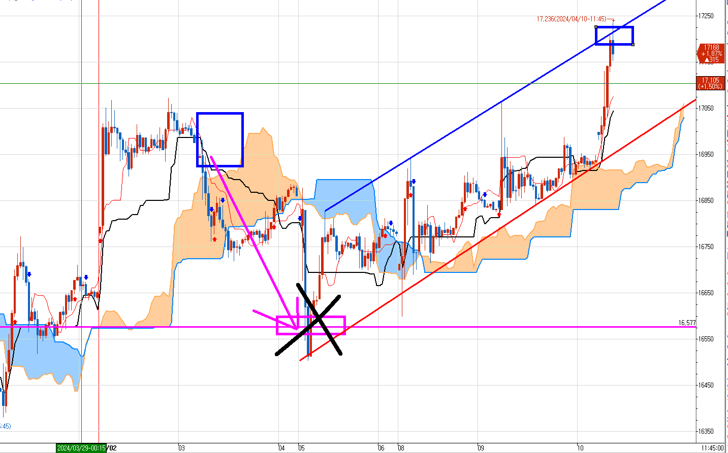 일목균형표 30분봉에 매도 목표가 발생했었다. 16577(분홍색선)