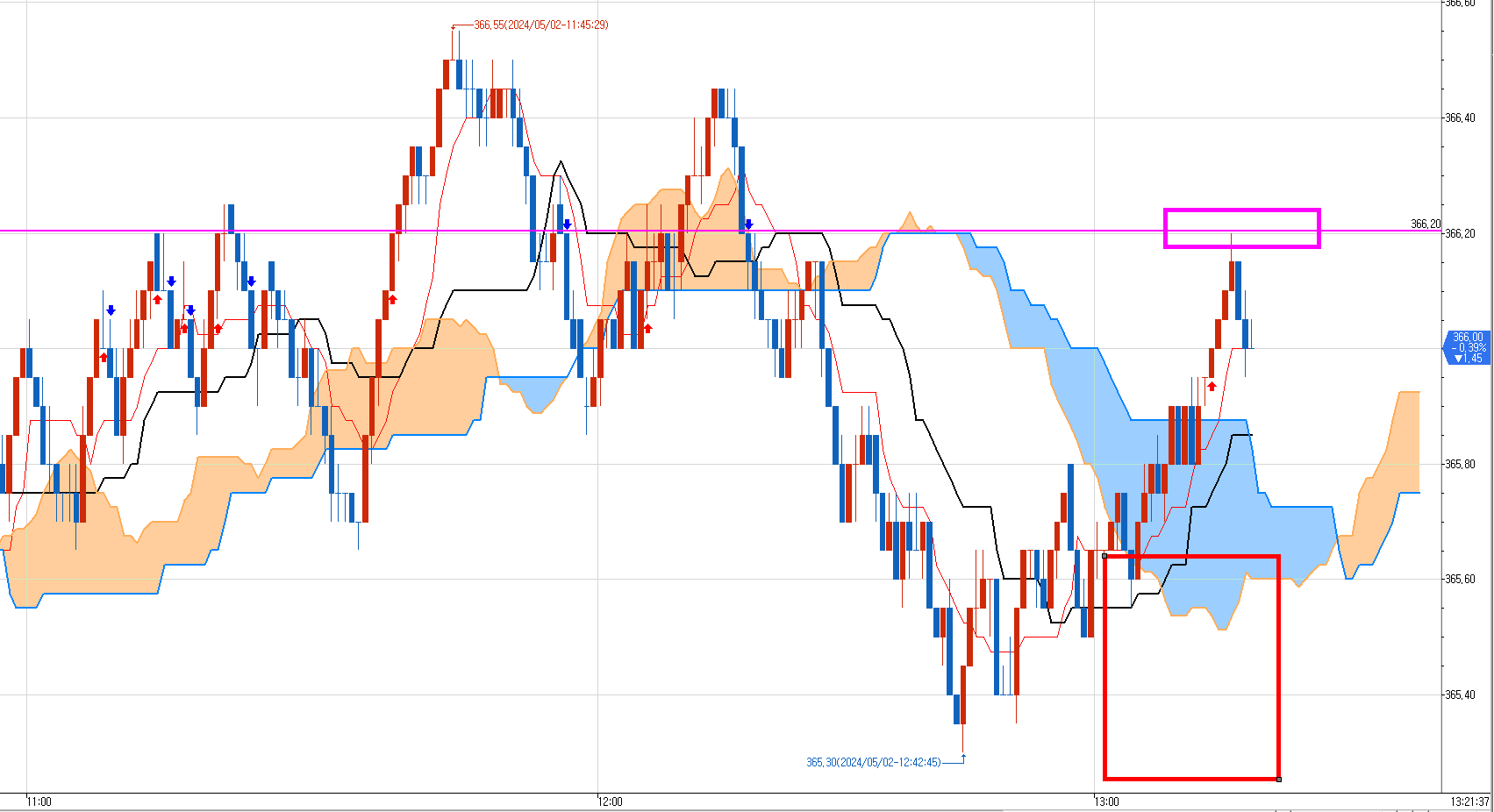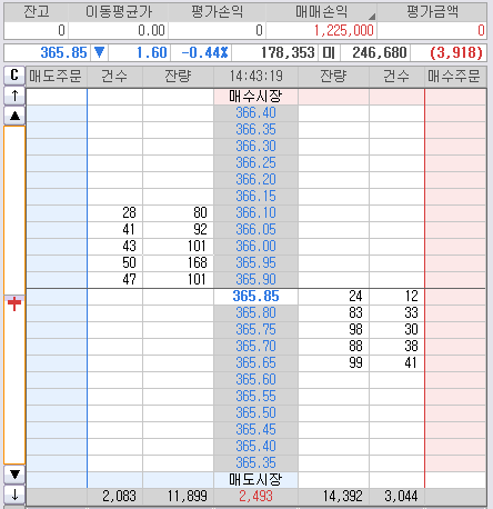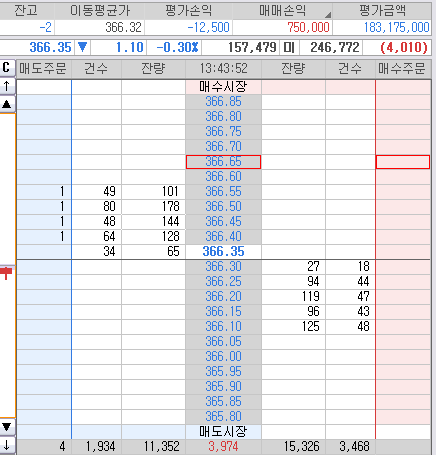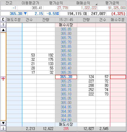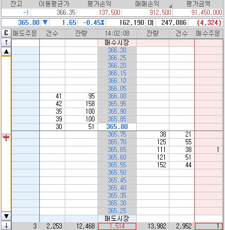 아래 빨간색 구간에서 매수 들이대서 366.20 부근에 올청산 완료!