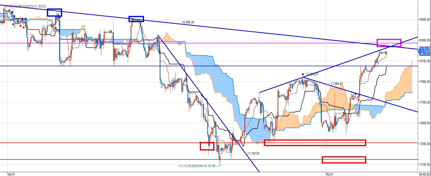 이번엔 그동안 매도 잘 들이댔던 윗쪽 파란색 저항선을 뚫을 것이다.