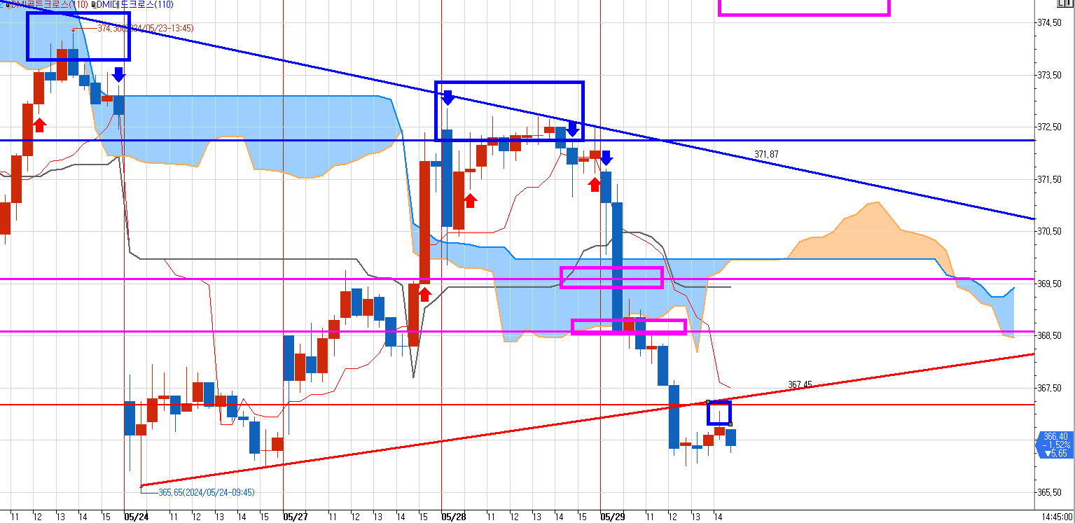 368.40 음봉으로 깨지면 366.75까지 빠진다고 했다.