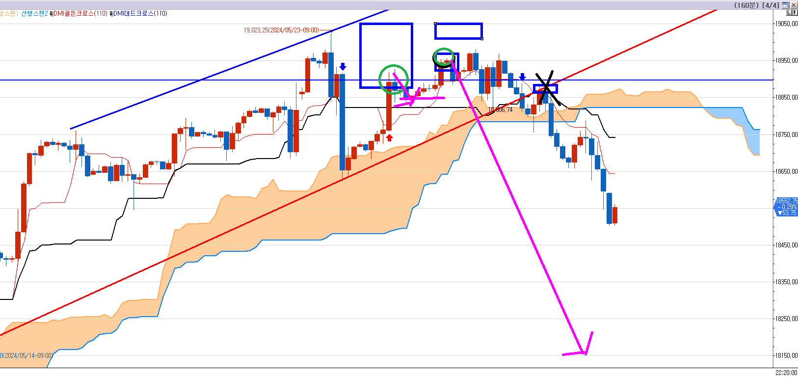 그제 새벽에 빨간색 지지선 깨졌을때 (X표시 파란박스) 왕창 10개 들어갈 구간인데..