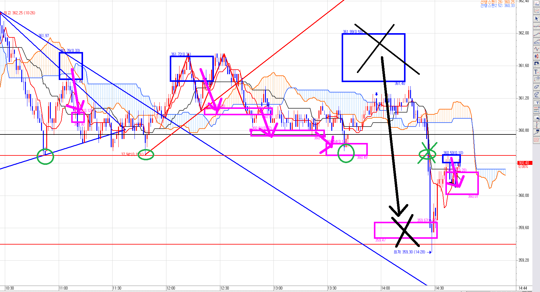 왜냐면 오늘장 전체 시장 뷰로 봤을때.. 360.50 저 빨간색 지지선이 깨지면 359.40까지 꼴아박을것이기 때문이다.