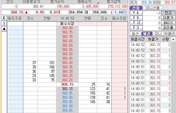 그래서 나는 오늘 매수는 안했다. 360.50 지지 받고 다시 올라올때 매도를 들이대고 있었던 것이다.