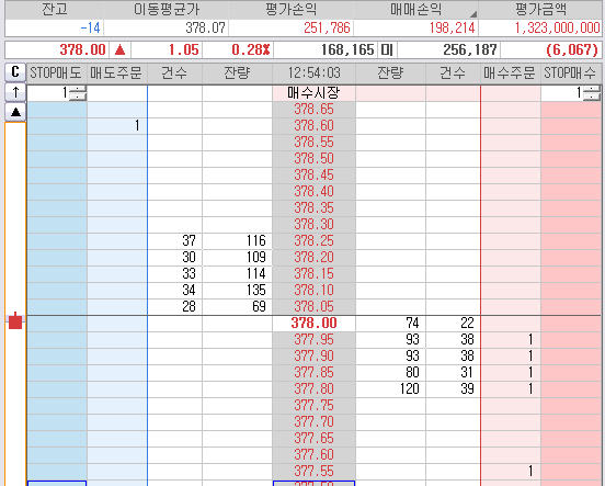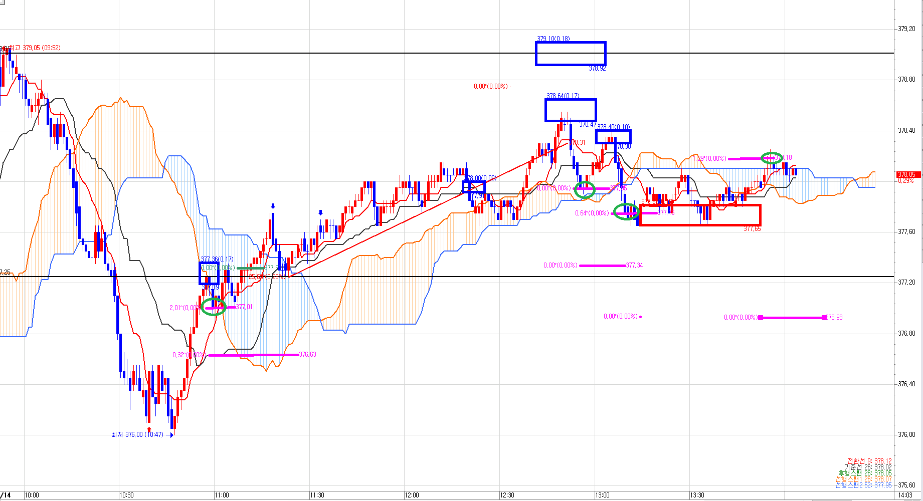 그래서 빨간박스 매수 진입하였다. 왜냐면 초단타 매수 목표가 378.20이 발생했기 때문이다 (윗 분홍색선)