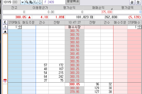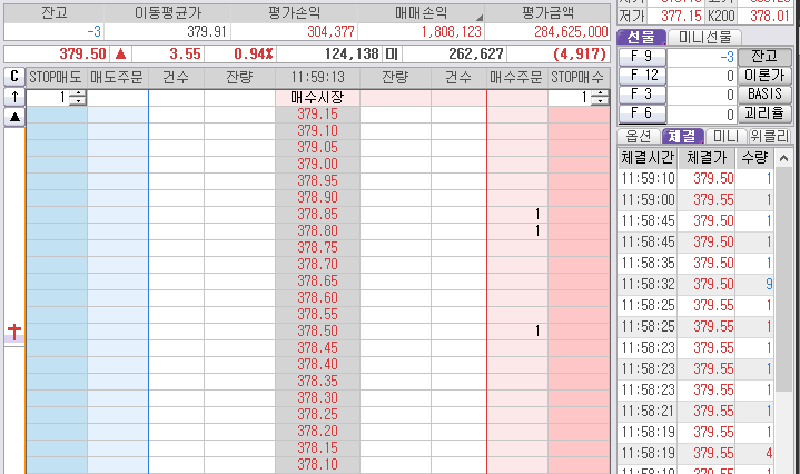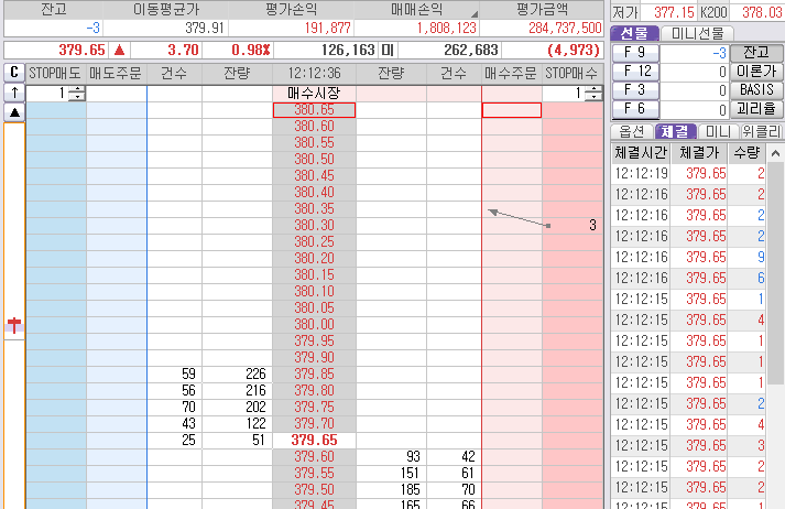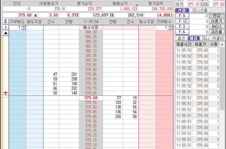 젠장~ 1틱 차이로 안 팔렸다. 그리고 다시 튀는데... 379.75를 양봉을 뚫었다.