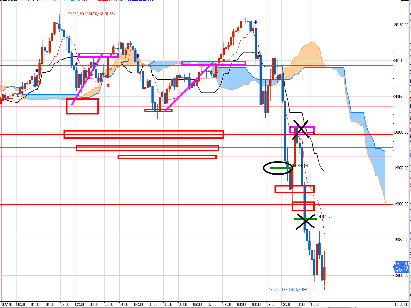 두번째 빨간박스, 다시 내려오길래 다시 1개 진입하여 윗 분홍박스에 또 다시 1개 청산