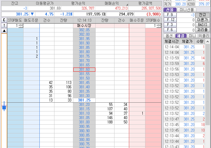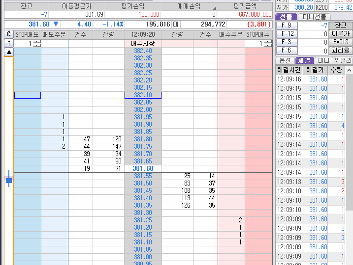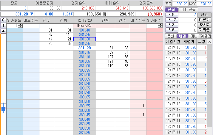 380.55는 팔렸는데...380.45 는 한틱 안치고 다시 튀어 오르는것 보자 마자 즉시 나머지 1개는 시장가에 던졌다.
