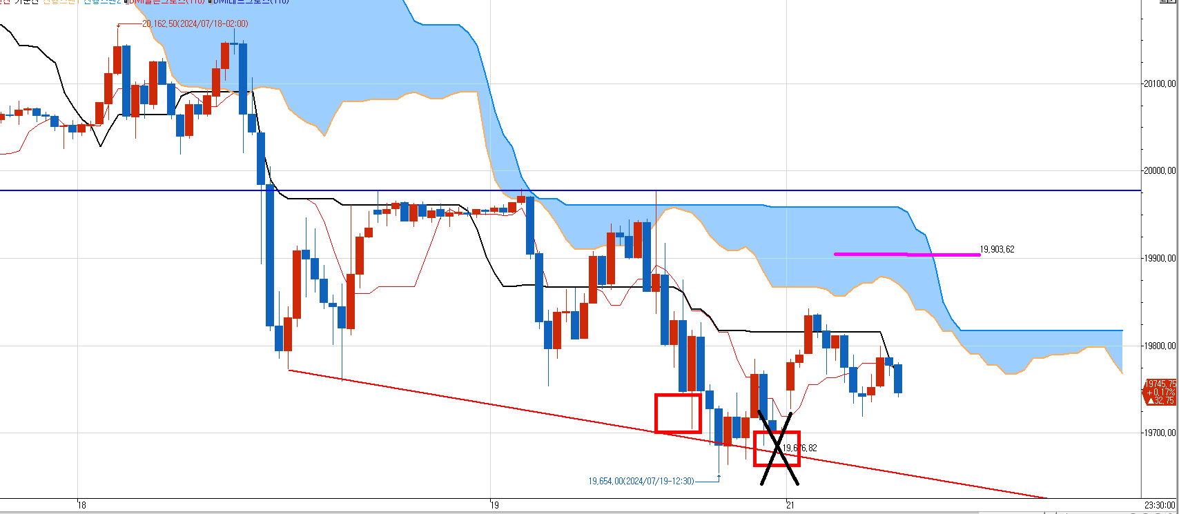 만약 파란선 양봉으로 뚫었다면 몽땅 즉시 손절 주었을 것이다.