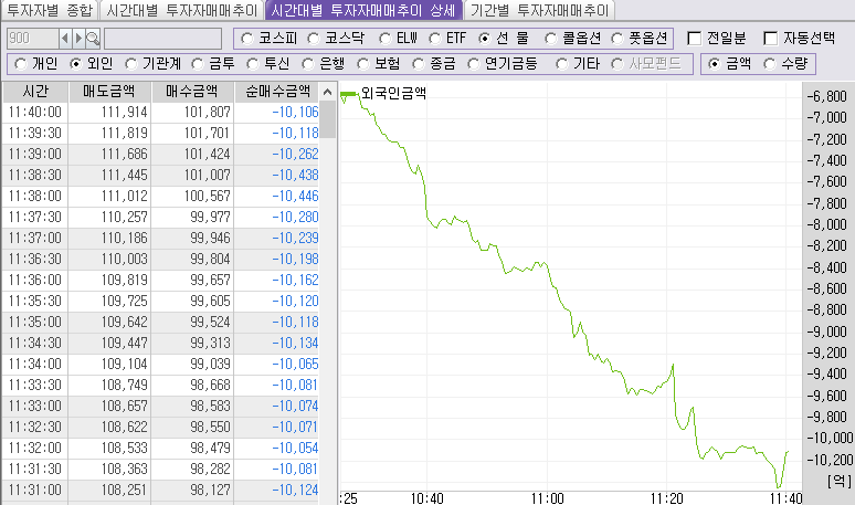 외놈들의 선물 매매 추이다. 작정하고 1조 이상 매도 치고 있다.