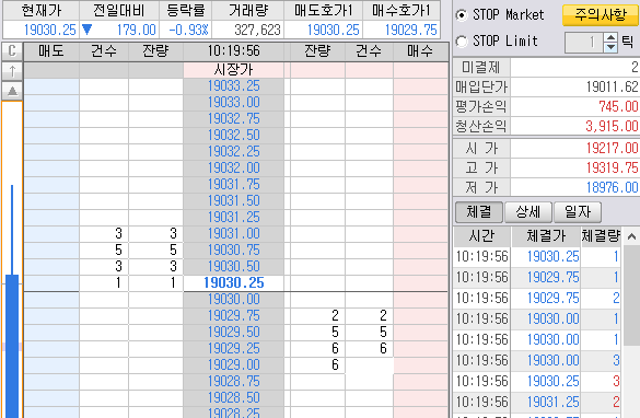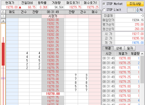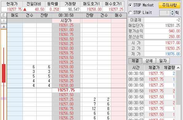 첫번째 박스 2개 매도 진입한 것은 곧바로 매도목표가에 청산 걸어 놨다. 300틱 2개 먹기~