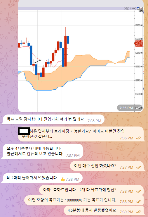 좀 정신은 없지만... 차트 선 긋고, 박스치고, 캡쳐해서, 텔레그램으로 보내고... 그러면서 매매도 하고..