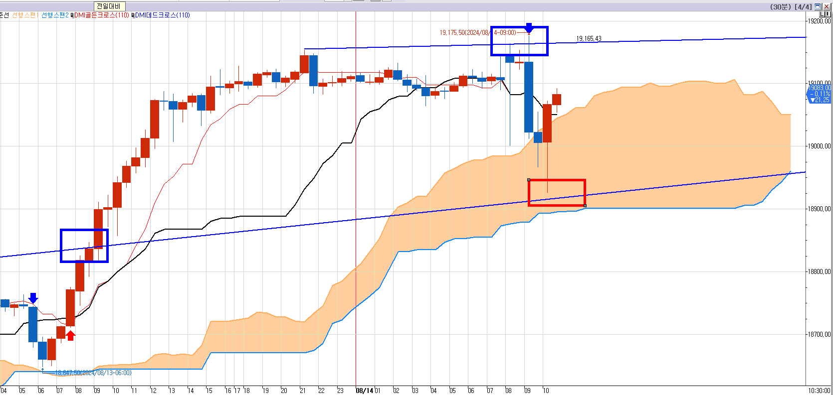 어젯밤 까지 저항선 이었던 파란 저항선이 어젯밤 뚫린 것이다 (왼쪽 첫번째 파란박스)