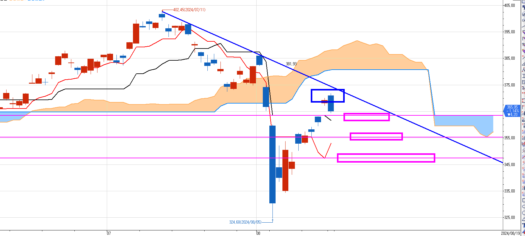 나선이의 최종 매도 목표가 19069를 맛있게 먹으려면.... 저 선들이 다 음봉으로(파란화살표) 깨져야 한다.