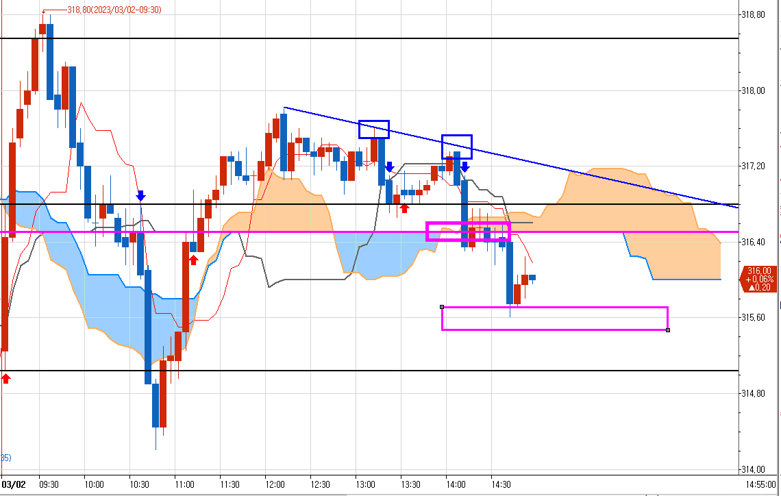 5분봉에서 오전에 밑으로 316.50 매도 목표가가 발생하였고 1분봉을 기준으로 파란색 박스 두곳에서 총 5개의 매도를 진입하였다.