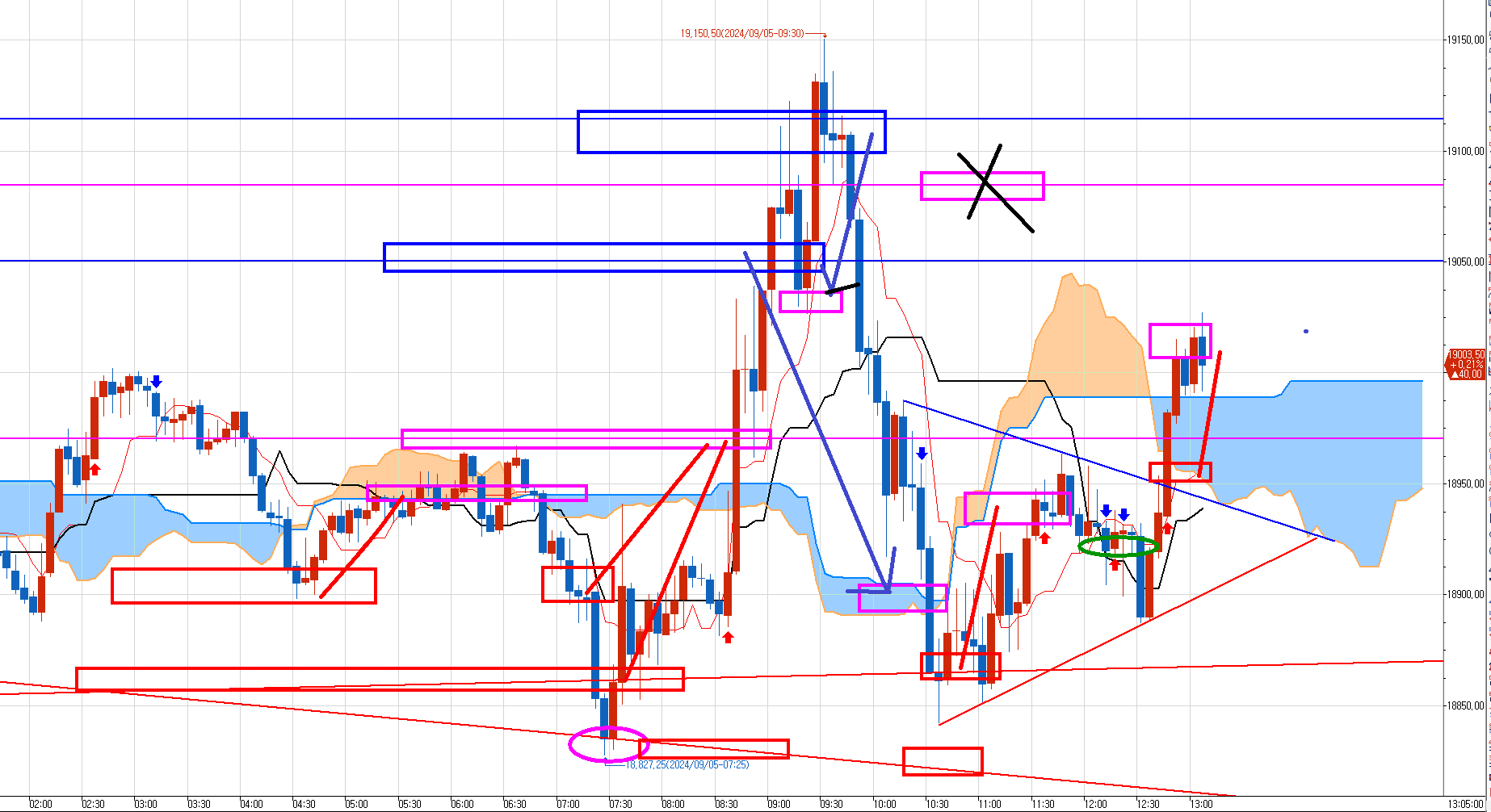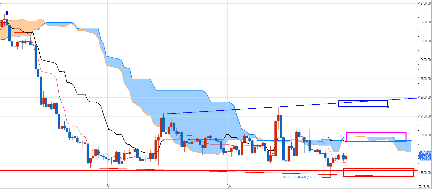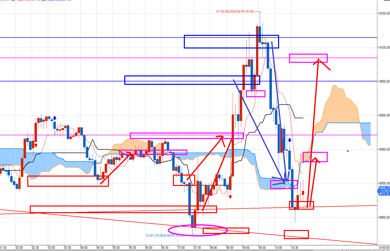 1개 최종매수목표가 윗 긴 분홍박스 18975보다 20틱이나 낮춰서 18970에 청산 걸어 놓았다.