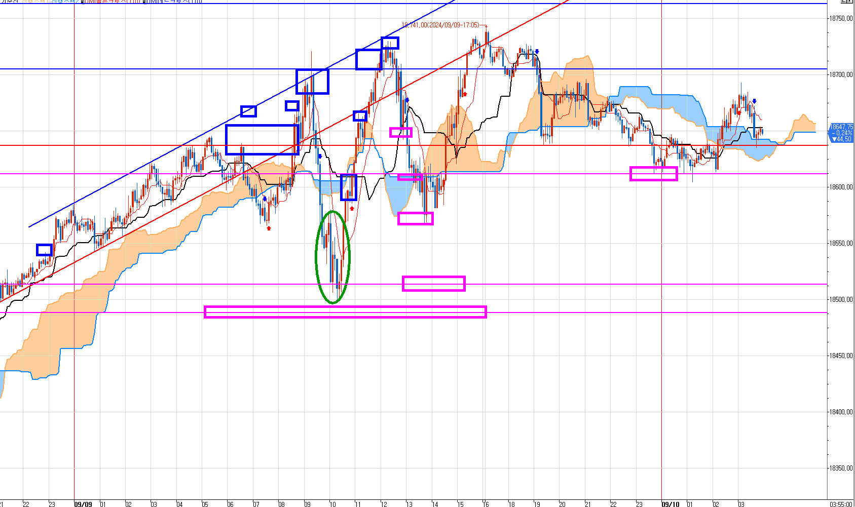 9월9일 오후 부터 9월10일 오후 현재 까지 나스닥 5분봉이다.