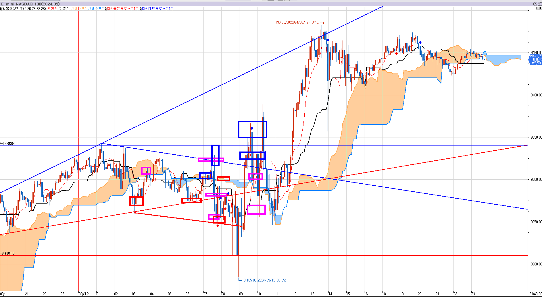 빨간박스 매수, 파란박스 매도, 분홍박스 목표가에서 청산.