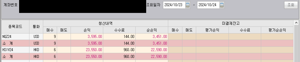 23일은 저녁때 행사가 있어서 매매를 못하기 때문에 낮장에 항셍을 매매했다.