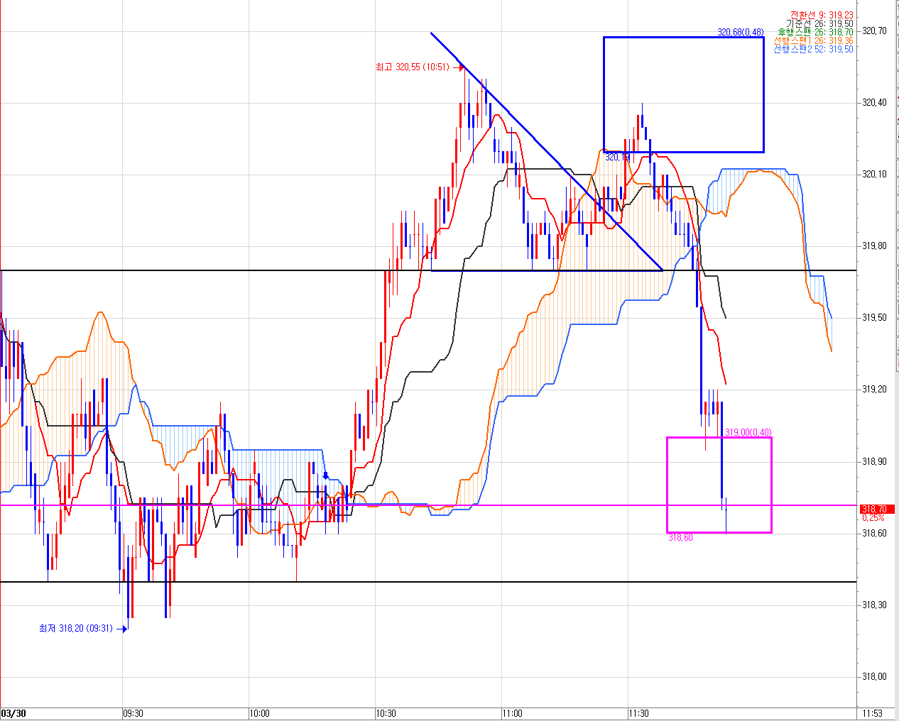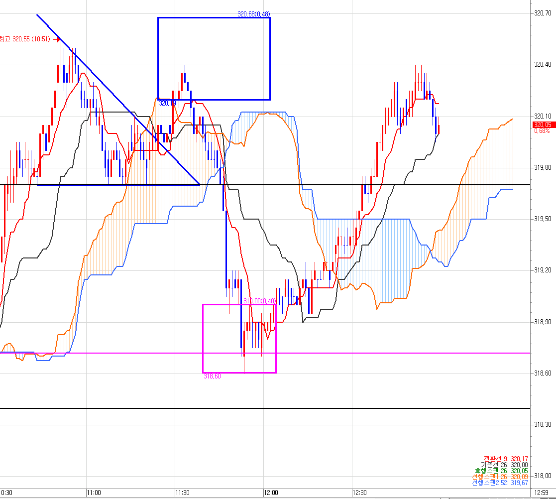 1분봉이 양운(주홍색 구름대)에 음봉 박히는것 확인 후 다시 튀어 오르는 320.20 ~ 320.70 까지