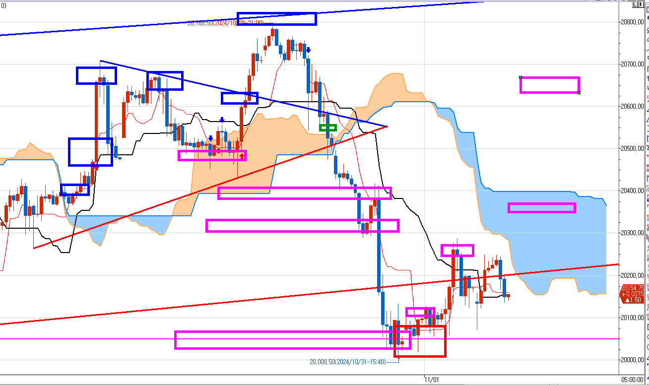 10월25일 지지난주 금요일 부터 매도 진입했다. 왼쪽 파란 박스들이 모두 매도 들이댔던 구간이다.