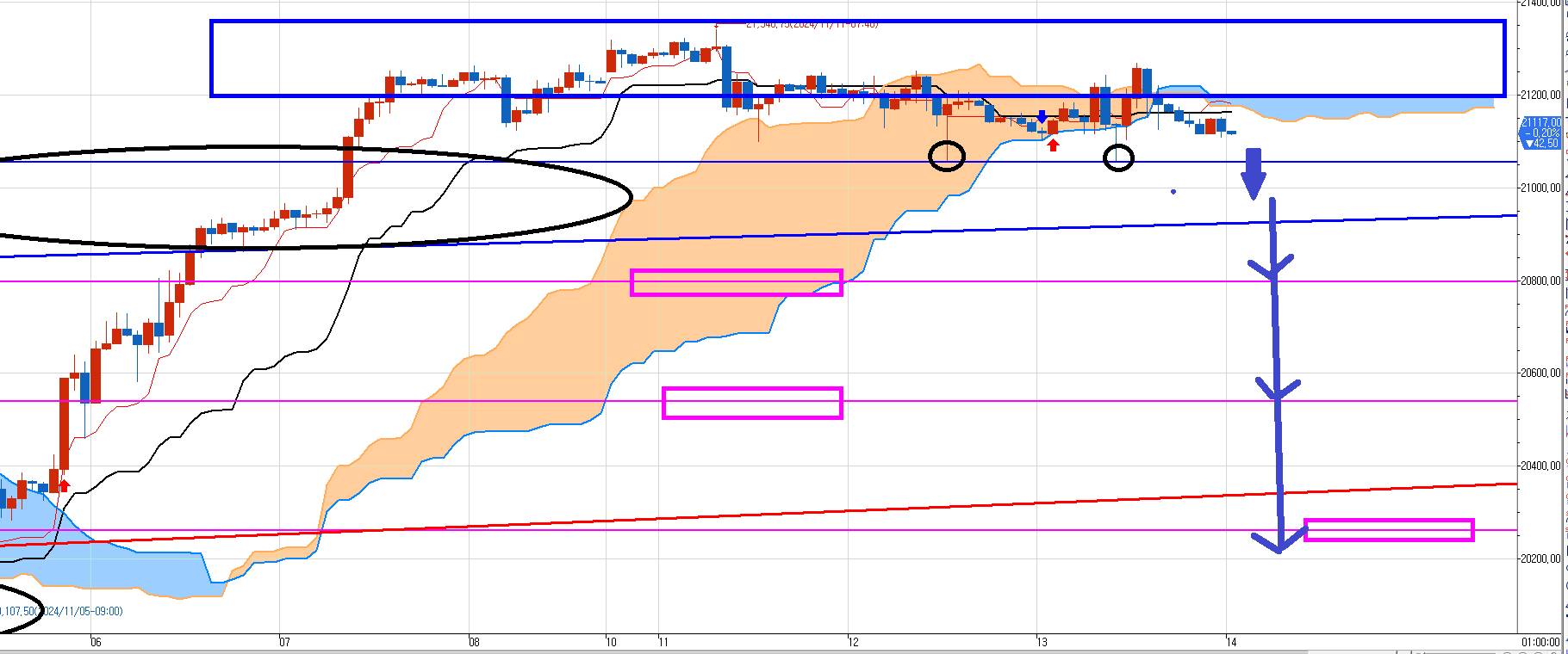 그러면 시간이 지나면 20797, 20540 을 치러 빠질 것이고 3차 매도목표가인 세번째 분홍박스 20260까지 갈 것이다.