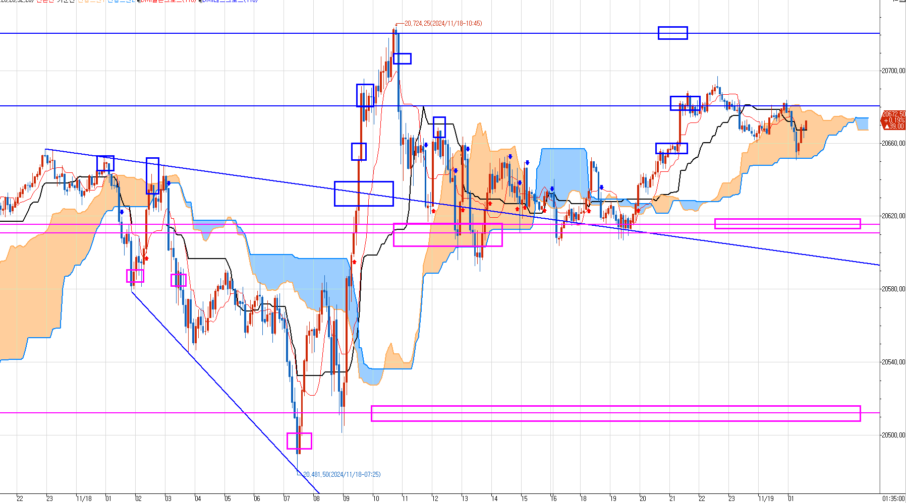 우리는 20620 위에서 매도 대기하고 있다가 위의 파란박스 5구간에서 분할 매도 진입했다.