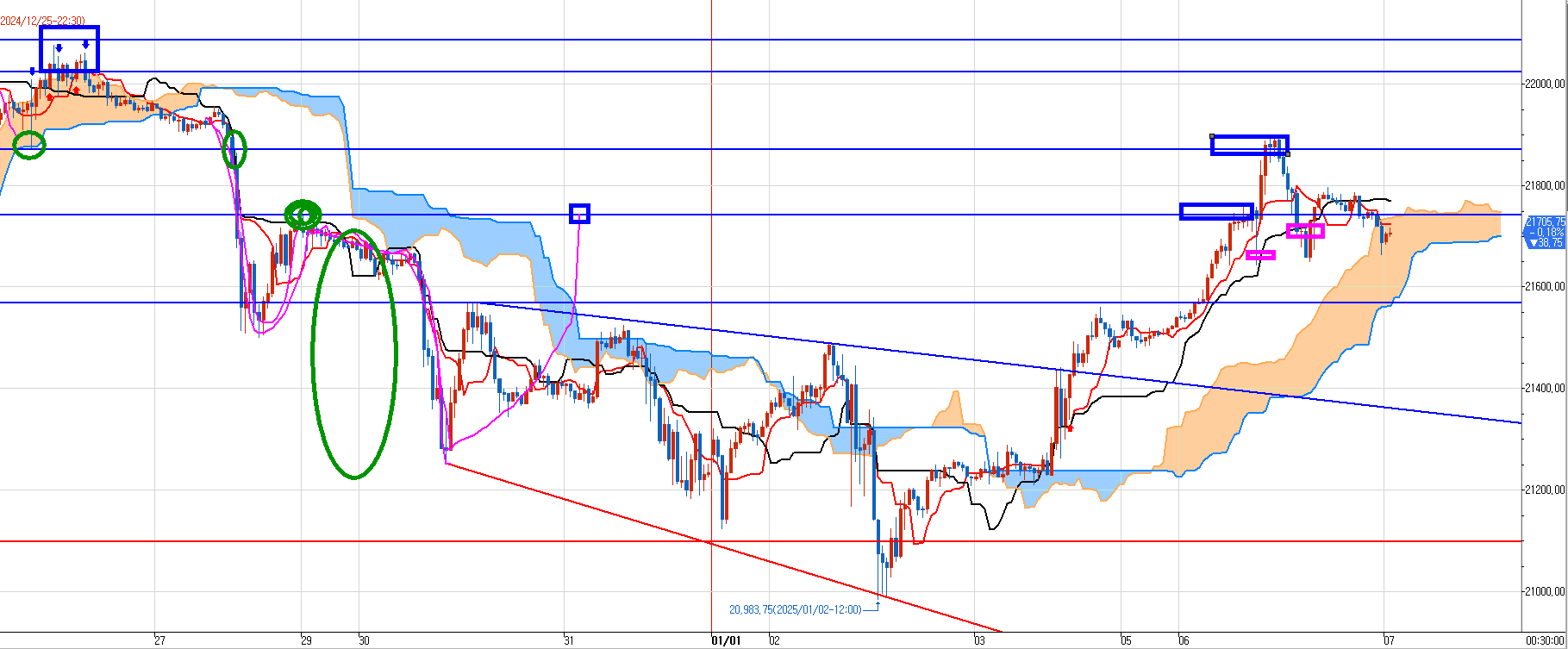 좌측 분홍박스 구간에 21700 매수목표가 청산 완료하고 관망!