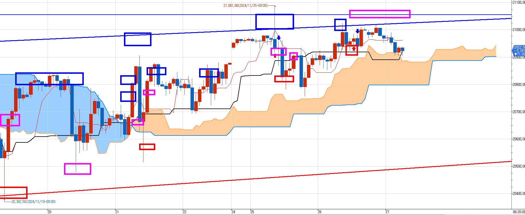 위로 두개의 매수 목표가 21015와 21065를 노렸으나.... 결국 어제는 안가고 오늘 아침에 21015를 찍었다.