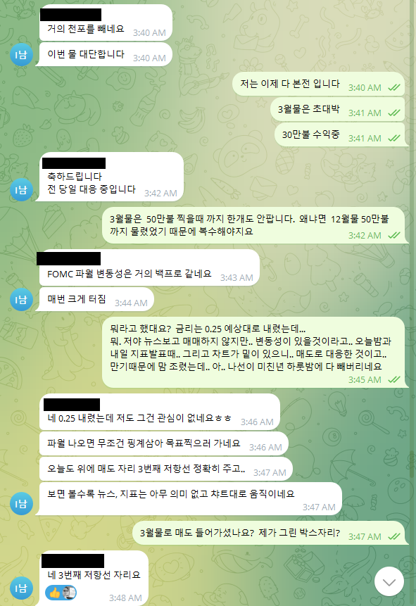 어제 알람 맞춰놓고 베트남 시간 새벽 1시50분에 일어나서 FOMC 발표 3분전에 3월물 10개 이미 화요일 최고점에서 매도 10개 진입한 것에 추가로 6개 더 진입하여 16개 홀딩하고~~~