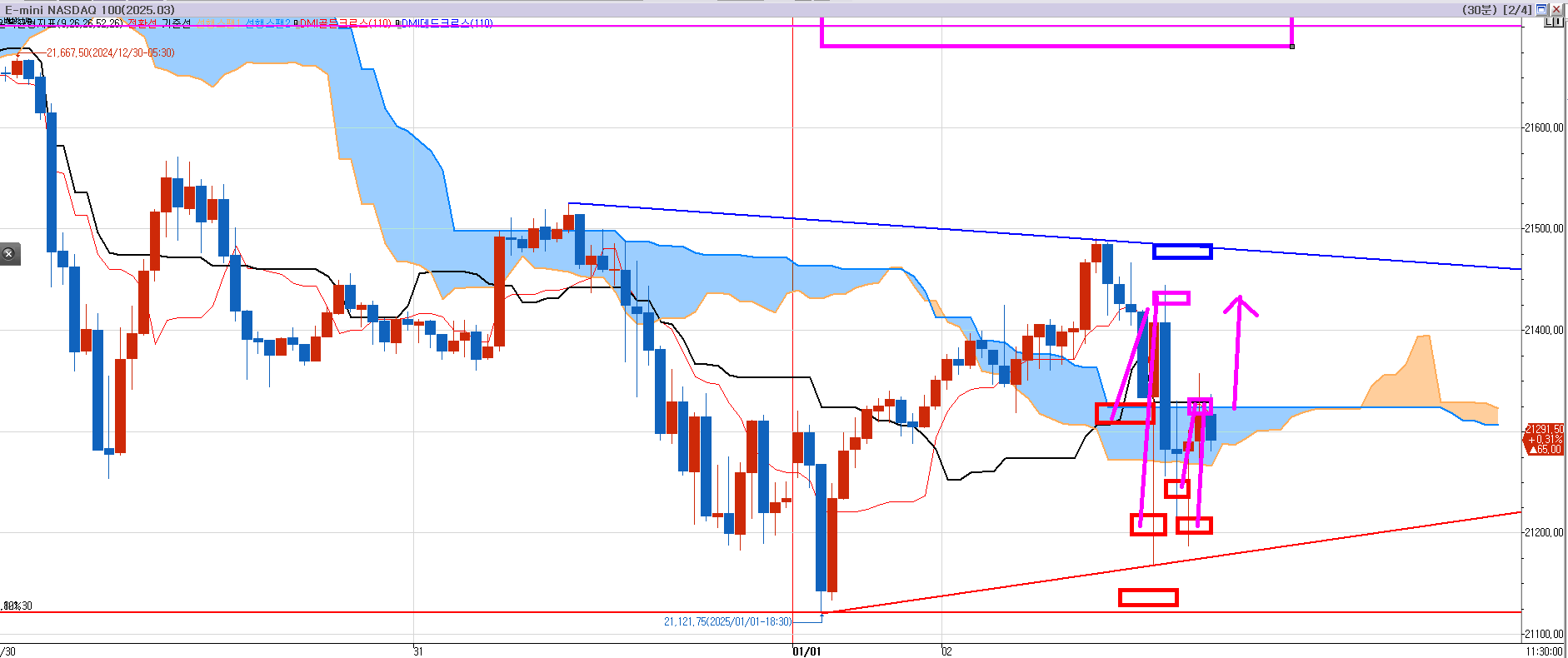 30분봉으로 보면 어제 저 구간에서 매수 분할 진입하여 어젯밤 발생한 매수 목표가에 청산한 것이다.