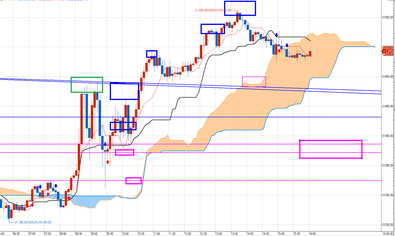 처음 초록박스 구간에서는 저 아래 분홍박스의 매도 목표가가 발생하기 전 이었고 다시 올라올때 매도 목표가를 만들어 논 것이다.