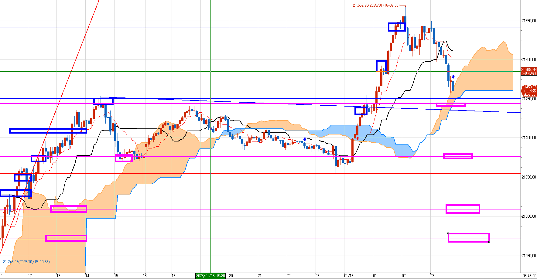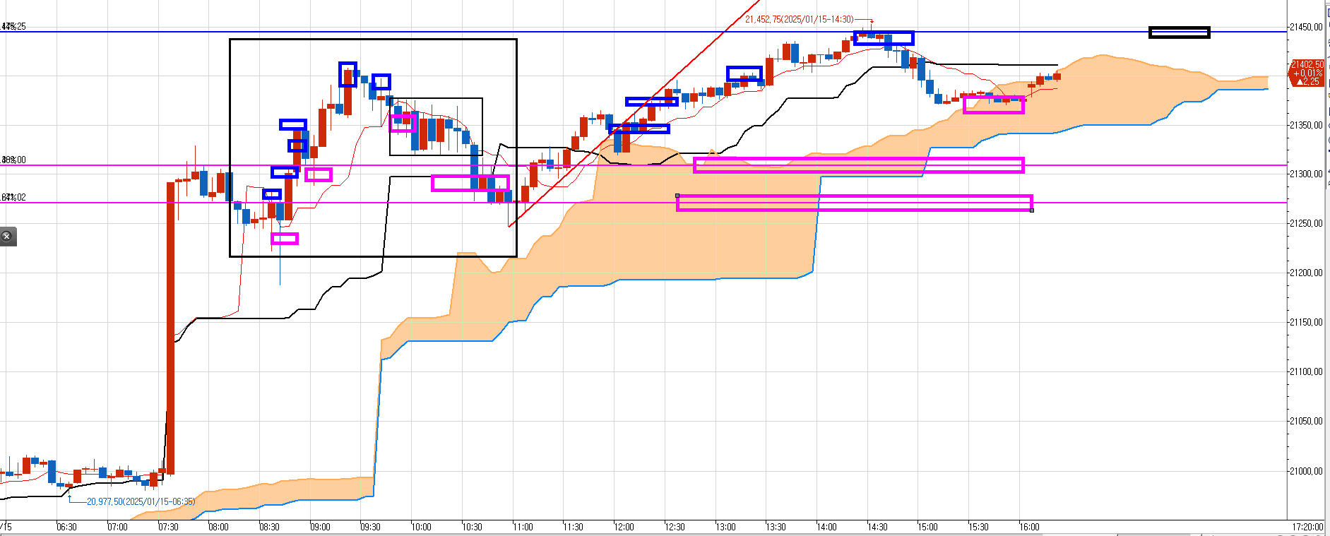 첫번째, 두번째 분홍박스는 오늘 오후에 쳐 올리면서 만든 반드시 찍으로 내려갈 매도 목표가다.