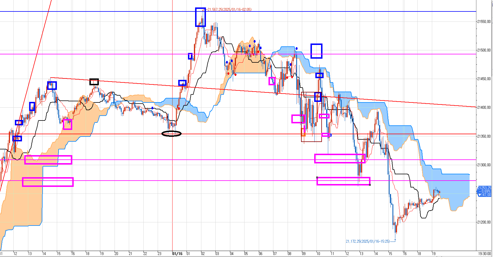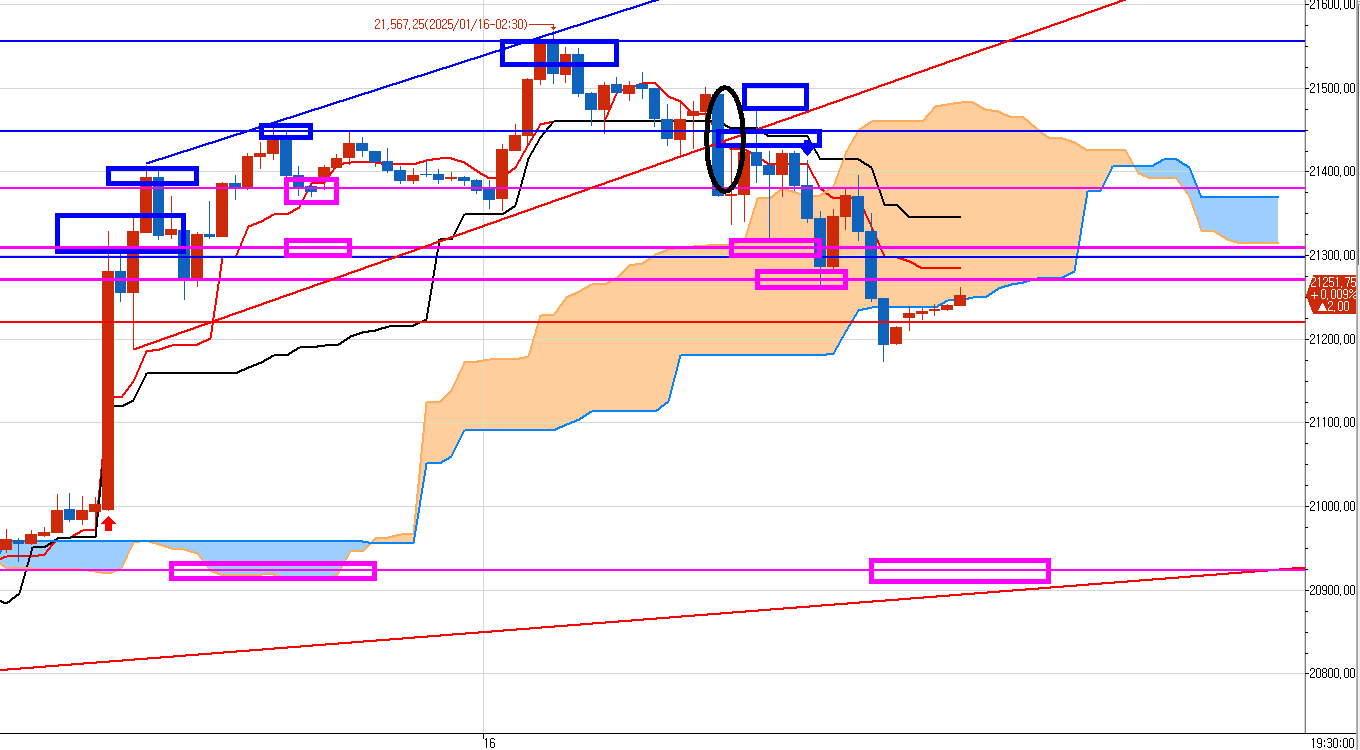 15일 밤에 발생한 아래 분홍박스 2개 매도목표가를 먹기 위해서 우리는 15일 밤 왼쪽 파란박스 구간에서 분할로 매도 진입하여 날밤을 꼬박새우고 나스닥 장 마감때 일단 윗 분홍박스에 50% 익절했다.