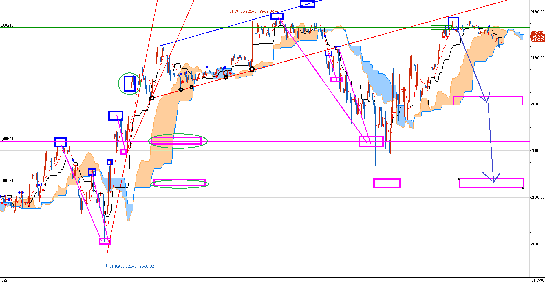 차분히.. 구간 구간 마다 매도 쳐서 아래 두개의 분홍박스에 분할 청산할 예정이다.